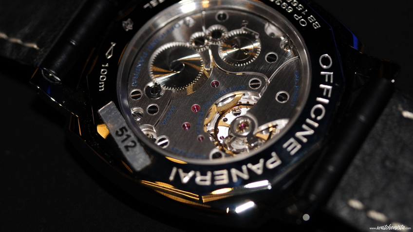 The new P.9100 / R caliber looks to be more than just a simple modular chronograph based on the P.9000. It is based on the pointing of the P.9000 with a fairly advanced integration of the chronograph module in the base caliber. Some elements of the chronograph appear through back of the case, including the column wheel, impressive for a brand like Panerai!