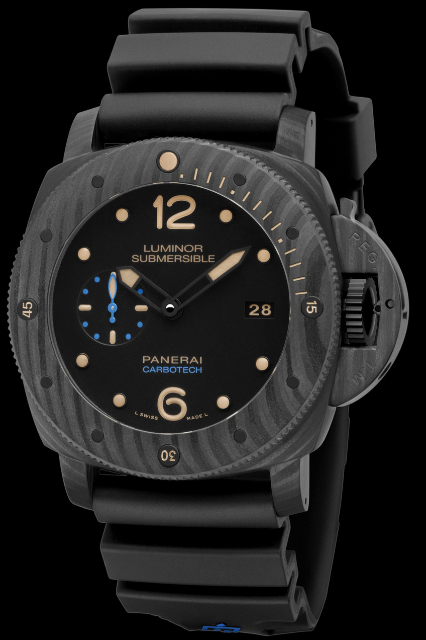 Officine Panerai’s Workshop of Ideas today turns to the future and presents a remarkable new technical innovation which makes each example of the new Luminor Submersible 1950 CarbotechTM different from the others. The case is made of carbotech, a composite material based on carbon fibre, never before used in the world of watchmaking. As well as providing exceptional technical performance, carbotech has an uneven, matt black appearance, which varies according the cutting of the material: the result is that each example is unique.