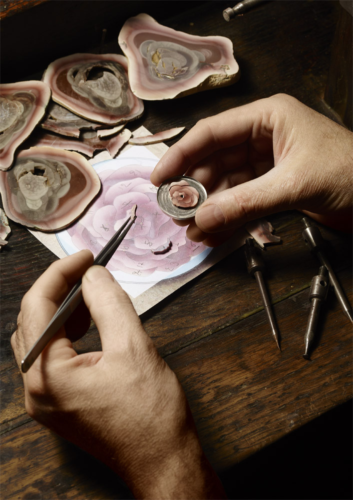 Like a delicate puzzle, the different petals are adjusted, and then assembled with careful precision on a flat surface. The joins are heat-sealed with resin. The assembled rose is then fixed to the gold dial of the watch.