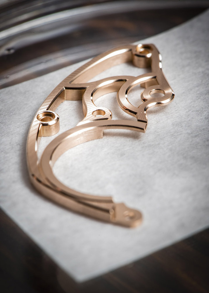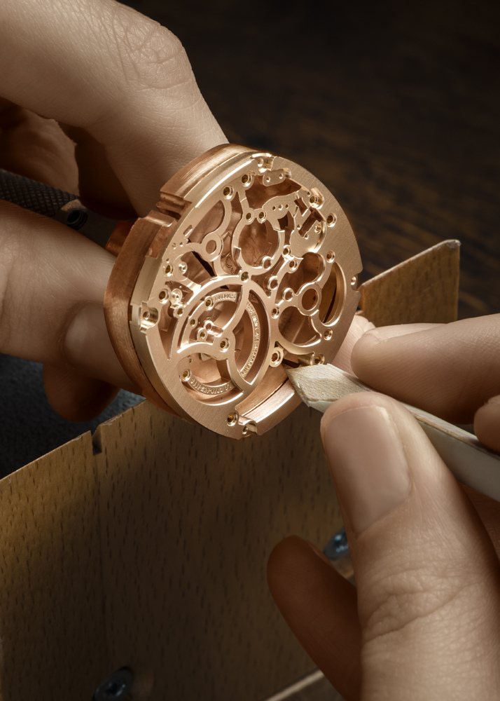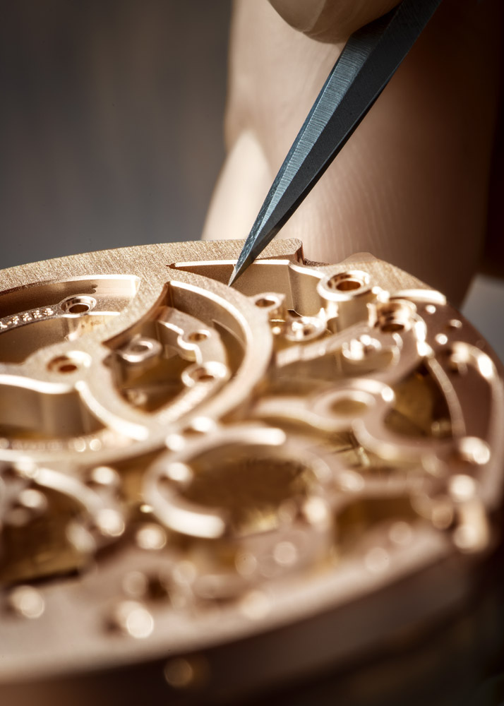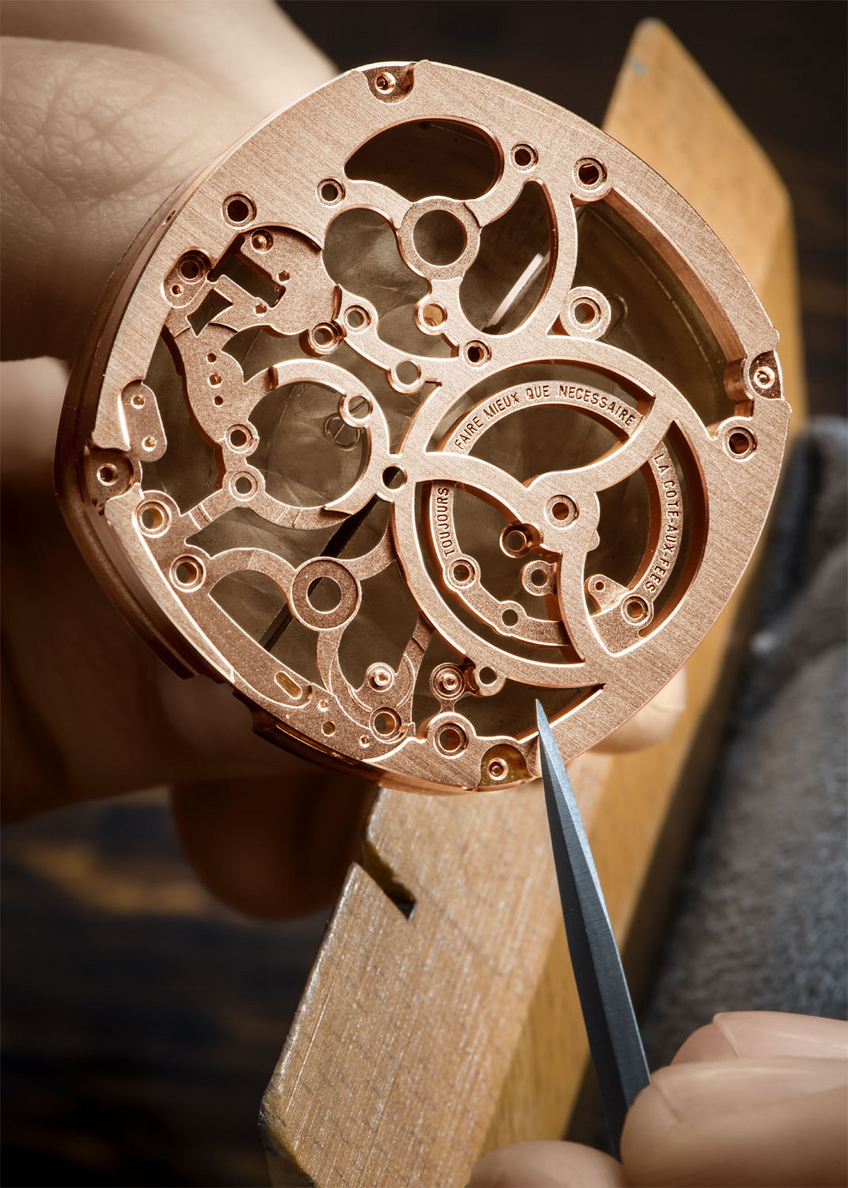 With 27 ultra-thin movements rewarded by 15 slimness records, Piaget has been testifying since 1957 to undeniable mastery in handling the major challenges related to the development of such ultra-thin calibres. In half a century of innovations, the Manufacture has established itself as a specialist of ultra-thin movements that are the authentic signatures of the Piaget know-how. When reduced to its bare essentials, even the simplest movement represents a complication in its own right and calls for an extremely delicate miniaturisation process requiring expertise, patience and dexterity. Regularly enriched with new simple or complicated movements, the range of ultra-thin Piaget calibres also comprises six skeleton movements. The latter represent an art that the Manufacture has been perpetuating since the 1970s, when it presented the first skeleton version of its ultra-thin 9P calibre. Skeleton-working an ultra-thin calibre is an exercise that demands the savoir-faire of the most experienced master engravers in order to openwork the movement as much as possible without compromising its rigidity, its resistance or its reliability. The Emperador Coussin 1270S is the end result of adding the complexity of the infinitely small to the constraints implied by a horological complication and its numerous components, further compounded by the automatic winding mechanism – bearing in mind that most skeleton movements on the market are hand-wound. It took no less than three years to develop this exceptional calibre, to accommodate 225 parts within a barely 5.05-millimetre area and to skeleton-work it while ensuring impeccable operation.